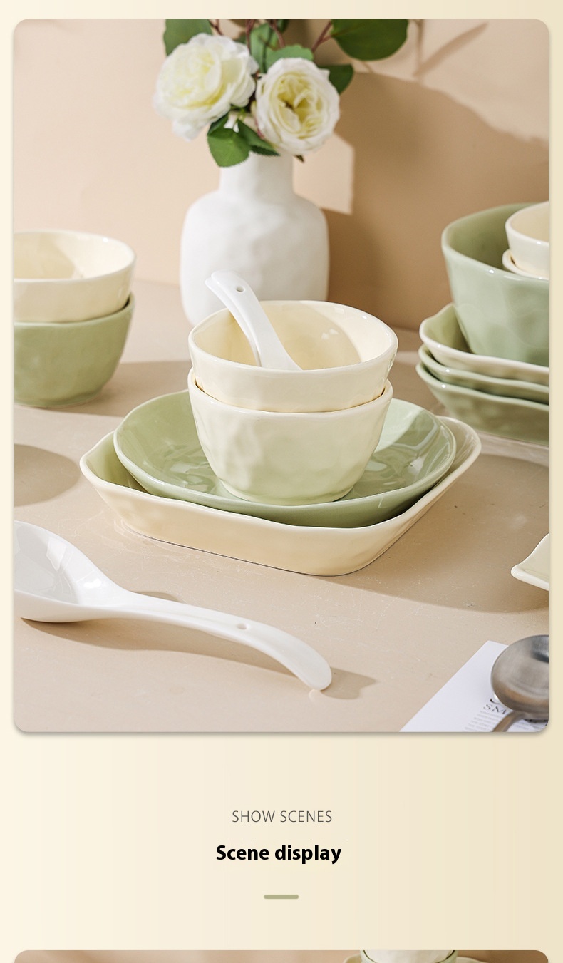Color: 4.75 inch bowl-cream yellow, 4.75 inch bowl-cream green, 4.75 inch bowl-XINGX purple, 8 inch bowl-cream yellow, 8 inch bowl-cream Green, 8 inch disc-cream yellow, 8-inch disc-cream Green, 8-inch disc-star Purple, 8-inch square plate-cream yellow, 8-inch square plate-cream Green, 8-inch square plate-star Purple, 4-inch sauce plate-cream yellow, 4-inch Soy Sauce Pickles-cream green, 4-inch Soy Sauce Pickles-star Purple, double-ear bowl-cream yellow, double-ear bowl-cream green, double-ear bowl-Starlight Purple